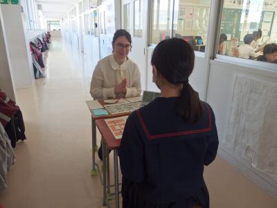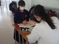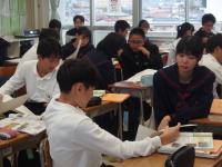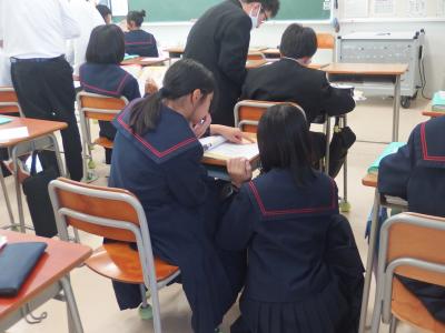 1年生の英語では、パフォーマンステストを行っています。外国人に道案内をするという課題で、ALTの先生に目的地の行き方について説明します。順序立てて、文法的に正しく、リズムよく発話できているかを評価されます。生徒は、地図を指さしながら一生懸命目的地への行き方を説明していました。