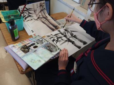 2年生の美術では、水墨画を模して水彩を行っています。見本をまねながら、上手に描いています。
