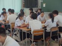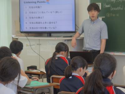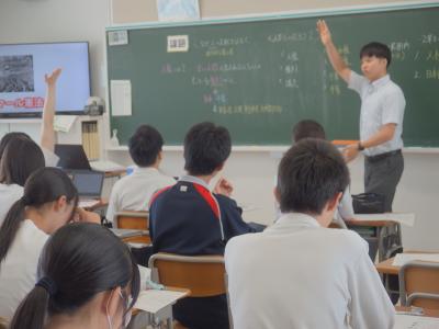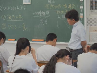 3年生の社会では、ワイマール憲法など人権の歴史の流れを、英語は教科書の内容に関する質問に英語で答えています。