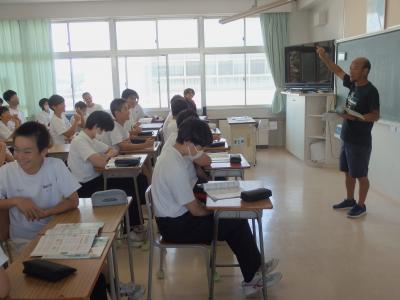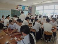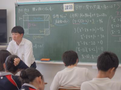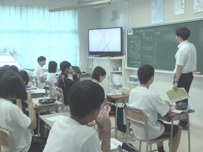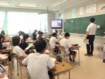 3年生の数学では図形の面積を二次関数を使って求めています。社会は自由民権運動について学び、英語はペアで本文の内容を確認し合っています。特別教室で授業を行っていて、使っていない3年生の教室がきれいに整理されていました。教室に戻って授業を受ける際、気持ちよく学べる環境になっています。