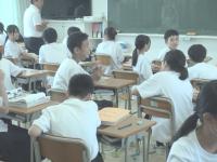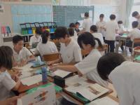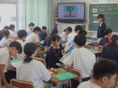 1年生の国語では初めて読んだ物語の感想を書いています。英語では夏の思い出を話し合います。はじめに先生が夏の思い出を紹介しています。社会では縄文時代からなら時代にどのように変化したかを考えています。