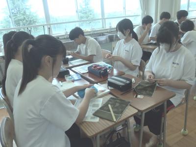 3年生の家庭ではポケットの両脇を縫い、技術家庭ではマイクロビットの制御プログラムを入力しています。