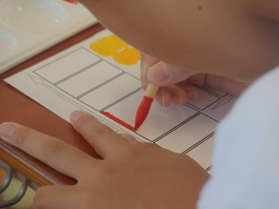 1年生の美術ではポスターカラーの塗り方についてこつを学んでいます。細かい箇所を塗る際は筆の先を持ち、水分量にも気をつけることを学んでいます。