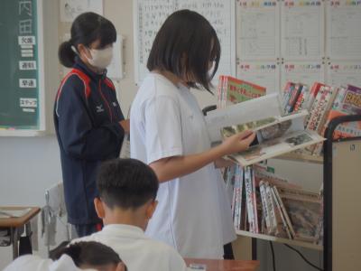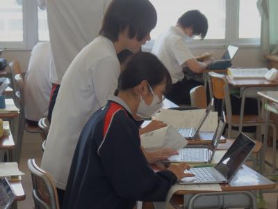 1年生の国語では、戦時中を舞台とした物語文の背景を探るため、関連図書で戦時中の生活を調べ、グループ内で発表します。英語では本文の内容について英語での質問に答えています。
