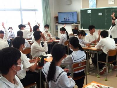 1年生の道徳では「いじめ」と「いじり」の違いについて考えています。たくさんの人が挙手をして自分の意見を言っています。ペアでも積極的に意見交流をしています。