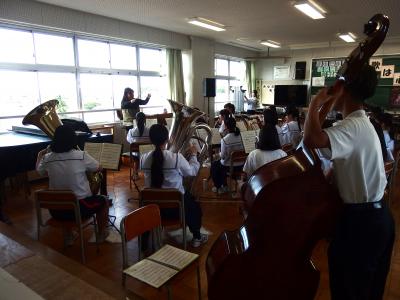 吹奏楽部はコンクールに向けて細部を合わせています。先生が強弱やタイミングなど細かい指導をして、それに合わせて演奏し直すなど確認をしています。緊張感を持って練習していました。