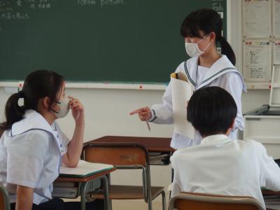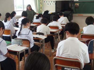 1年生の英語ではALTからのクイズに答えたり、ALTにクラスメイトを紹介する準備をしたりしています。国語では説明文で筆者が伝えたいことを、キーセンテンスに注目して読み取っています。音楽では「夢の世界を」の歌練習を、美術ではズックの模写を仕上げています。構図を意識していて、バランスの良い描写になっている人が多いです。