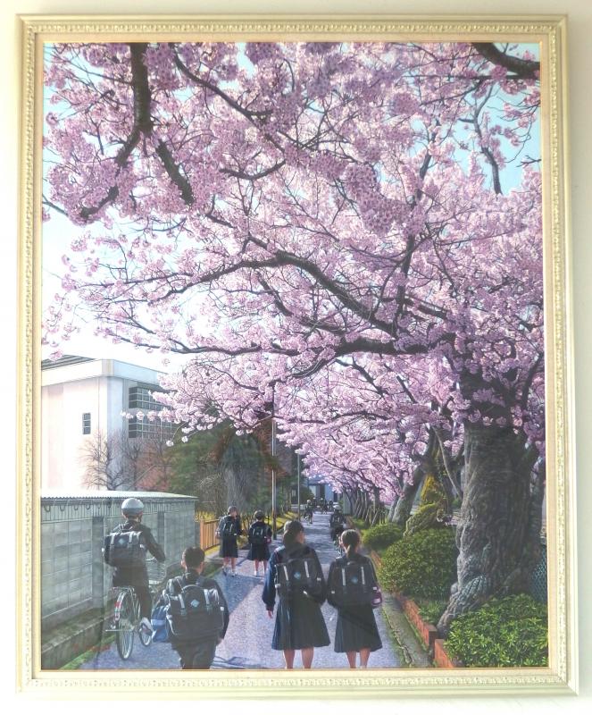 どの作品も素敵なのですが、今回は東階段を上がって3階にある絵画「希望に向かって」という作品を紹介します。満開の桜が咲く中央通りを登校する松任中学校の生徒を描いた作品です。まるで写真のように精巧で、また、松任中ならではの風景が切り取られていて、思わず立ち止まって見入ってしまいます。この作品は、本校卒業生で、美術教師をしていた谷中清悟氏の作品で、古川孝志24代校長が製作を依頼し、寄贈してくださった作品です。当初は中央道りの桜と別のもう1案の構想があったそうですが、古川元校長がぜひ中央通りの桜をと依頼し、1年がかりで完成したそうです。