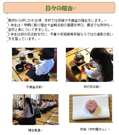 これからも楽しいお茶会ができるよう、日々のお稽古を精一杯頑張りたいと思います。
