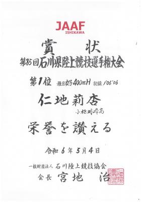 今年度の競技結果をもって、陸上部2年生の米田圭吾さんが小松市スポーツ記録賞を受賞しました。