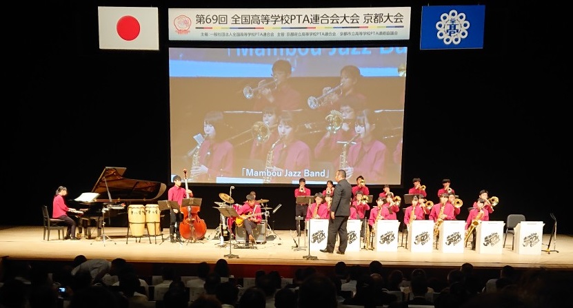 開会式前のアトラクションでは、京都府立工業高等学校吹奏楽部による、高校では珍しいジャズバンドの演奏が行われました。開会式では、本校副PTA会長の漆原さんが、全国大会会長表彰個人の部で表彰状を受けられました。