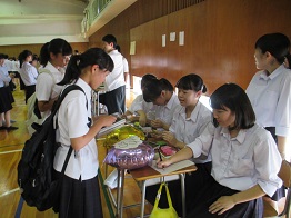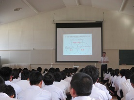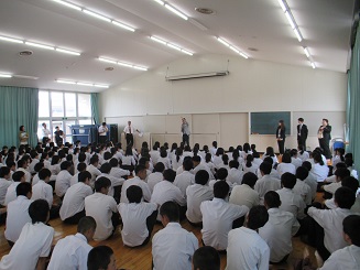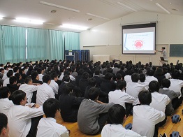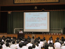 ↓全体説明会で本校の特色や部活動などについて説明を受けました。