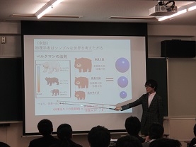 「物理学と化学と生物学の違いは?」「オリオン座のベテルギウスがなくなるかも?」「京都大学を選んだきっかけは?」など関心をひく話が盛りだくさんで、生徒たちは真剣な表情で聞き入っていました。