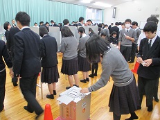 立候補した生徒からの演説が行われ、その後各教室で投票を行い、全員信任となりました。