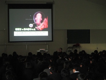 新しくなった視聴覚室設備を見て、大きなスクリーンで明る