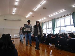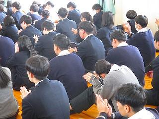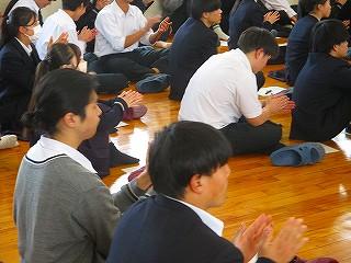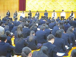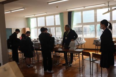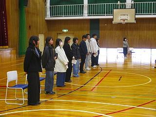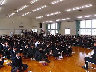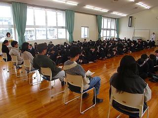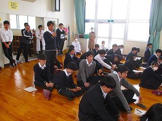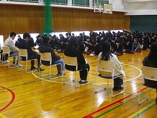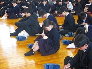 卒業式予行では、卒業式本番に参加しない1年生を含めて全校生徒で校歌斉唱しました。