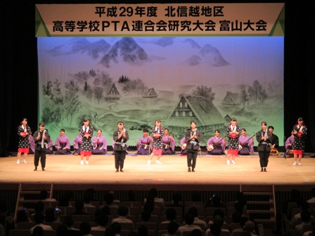 本校からは、渡邊PTA会長をはじめPTA役員・教職員合わせて10名が参加しました。開会式後の歓迎アトラクションでは地元の富山県立南砺平高等学校郷土芸能部による五箇山民謡の歌唱と踊りが披露されました。伸びやかな歌唱と優雅な踊りに対し、参加者から盛大な拍手が送られました。