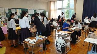 これまでの明峰祭は8月末に3日連続で「体育祭」と「文化祭」がおこなわれていました。昨年の8月18日から31日まで小松市は「緊急行動期間」となり「明峰祭」は中止になりました。とても残念でした。コロナ禍においてもなんとか学校行事を生徒のために実施したい、学校行事を通して生徒の成長につなげたいと考え、今年度は「体育祭」を6月に実施して「明峰祭」は8月27日(金)、28日(土)の2日間と開催を分散しました。明日は小松市公会堂。会場には全校生徒の半数(約350人)が入場し2部制にして密を避けます。感染症対策の基本事項である①マスクの着用②人との距離確保③手指消毒④換気⑤黙食を徹底します。2日目の飲食は指定された場所で受付(名前記入)をおこない、入退室時間やテーブルも指定します。利用者が変わるごとに消毒をします。これらの感染症予防対策を徹底し、活動に制限もありますが、その中でも輝く明峰生の活躍が楽しみです。写真は準備する3年生。