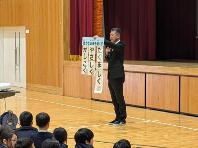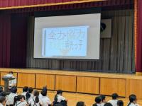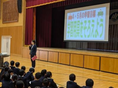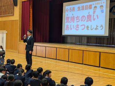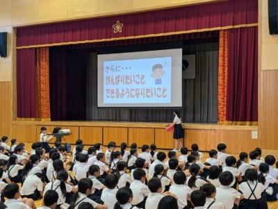 9月29日に10月の全校朝会を行いました。今月は校長先生のお話のあとに、「自分の思いや考えを積極的に伝える力」とはどんな力か全校で確認しました。