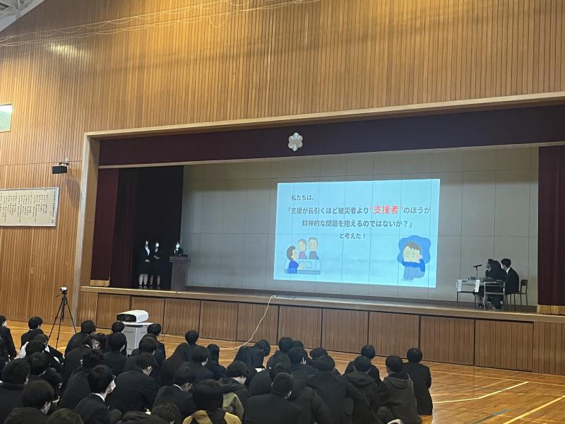 「高等教育における電子化の影響~!メイリンノキカイカ!?~」班(画像左下参照)は、DXハイスクールとして今後たくさんのデジタル機器が整備される中、明倫高校としての電子化の方向性について探究しています。「震災における支援者の心理的影響について」班(画像右下参照)は2024年1月1日の能登半島地震の影響を被災者ではなく、支援者の方に目を向けた探究活動を行っています。実際に輪島市にも足を運び、自分たちの目で現状を確認してきました。