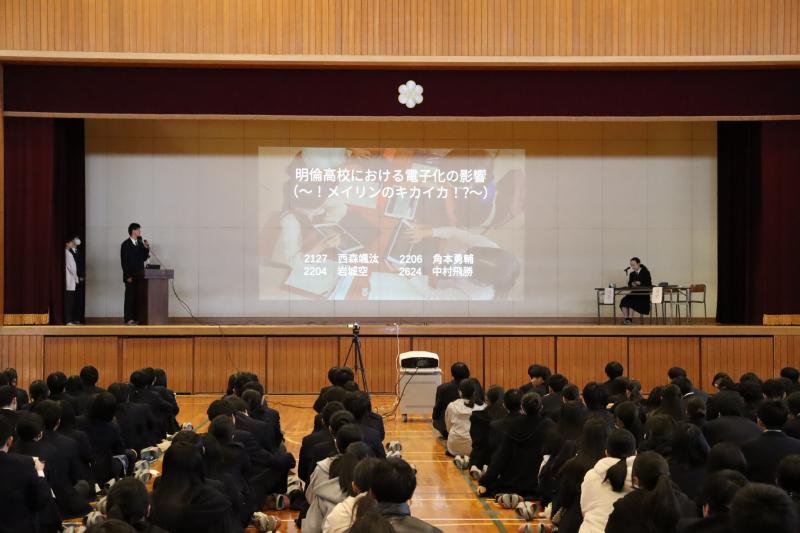 本校2年生 西森さん、角本さんの「高等教育における電子化の影響~!メイリンノキカイカ!?~」班