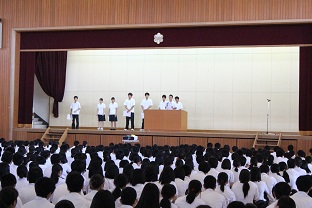 学校長、生徒会長からの激励の言葉を受けて、感謝の気持ちを忘れず、勝利を目指して全力で戦ってくることを誓ってくれました。持てる力を存分に発揮し、栄冠を勝ち取ってきてくれると信じています。