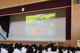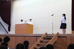 最初は、受賞報告会。1学期に様々な大会で賞をいただいた陸上競技部、レスリング部、フェンシング部の生徒たちによる報告です。それぞれが頑張ってきたことや応援への感謝、上位大会への決意を語ってくれました。