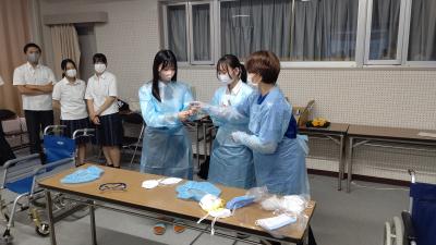 最初に看護師の魅力や仕事の内容について説明いただいた後に、車いす、松葉杖、血圧計、聴診器、防護服を着用させていただく実際の業務に即した体験をしました。生徒につきましては、現場の方の声を聴き、業務に携わる体験をすることで、今後の進路実現に大変参考となる看護ガイダンスを実施することができました。