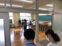 玄関ピロティでは、本校ボランティア部が受付係を担当し、吹奏楽部が屋上からの演奏で中学生を歓迎しました。教室では副校長によるリモートでの歓迎のあいさつの後、学校紹介動画の上映、質問への回答がおこなわれました。教室での説明の後、多くの中学生が部活動見学に参加しました。