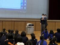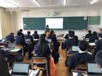 1年生の生徒たちは、視聴覚室から遠隔配信される講演を各教室で視聴する形で受講しました。