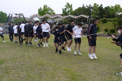 あいにくの曇り空でしたが、1年生は松任総合運動公園に向けて元気に本校を出発しました。片道5km、長いと思っていた道のりも友達と楽しく会話が弾み、あっという間だったようです。到着後に実施したクラス対抗大縄跳び大会では、16Hが男女合計28回跳んで優勝しました。クラスの仲間と一生懸命、記録を伸ばそうと取り組む姿が印象的でした。帰りの雨が心配だったので、予定より早く学校へ帰りました。交通ルールもしっかり守り、雨が激しく降る前に、無事に学校に戻ってくることができました。クラス内やクラスを超えて親睦を深めることができた遠足でした。