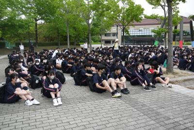 今回の避難訓練は、地震に伴う火事という設定で、出火場所は避難時までは知らせないという形で行いました。生徒や教員はどこから出火したかの放送を聴いて、避難経路を判断してグラウンドまで避難しました。