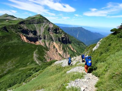 《3日目。鳶山を越えて越中沢岳を目指す。正面には薬師岳、まだまだ遠い》