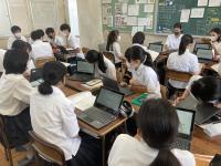 本日、2年生が総合的な探究の時間で、金沢工業大学とリモートで結び、「SDGsカードゲームワークショップ」を実施しました。