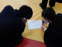 ペアでしゃべらず一筆書きずつ似顔絵を作成する活動(TWOドット)やグループ対抗ヒント取り合戦といったグループワークを行いました。
