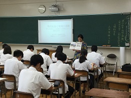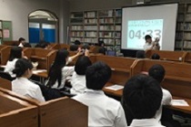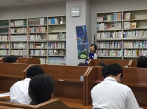 7月5日(金)午後、学びの杜ののいちカレードの瓜生さんをお招きして、読み聞かせ講習会が開催されました。「ののいち子ども読書の日」取り組みの一環です。図書委員だけでなく、今年は英語部員も参加しました。