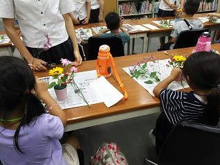 7月30日(火)、野々市市内の放課後子ども教室の児童13名が本校を訪れました。「ののいち子ども読書の日」関連事業の一環で、今年で8年目となります。図書委員、サイエンス部、新聞部が正面玄関で児童を出迎え、まずは校舎内を案内し、続いて図書館の中でさまざまな体験をしてもらいました。