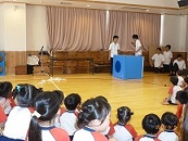そして英語部の出番です。ジェイコブ先生のギター伴奏で、”If you're happy and you know it”という歌に新ALTのティファニー先生も加わっての披露となりました。そのあとは、英語で絵本の読み聞かせをしました。