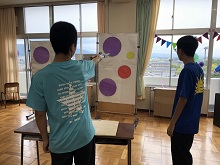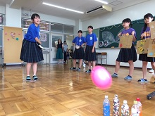 英語部に続いては、サイエンス部による恒例の空気砲実験です。子どもたち1人1人に空気砲を体験してもらいました。的(まと)が倒れるたびに子どもたちから歓声があがっていました。