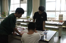 補習の午後、のぼりの制作が行われています。工事の関係で、今年は第1体育館の一角で作業後行われ、22日は1年生、23日は2年生がのぼりを作りました。暑い中、生徒たちは熱心に取り組んでいました。明倫祭本番の際は、ぜひご覧になってください。