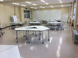 もちろん、工事は終わり前後にホワイトボード、据え付けのプロジェクタなどの施設はできあがっていたのですが、このたび、専用の机やいすなどの備品が調いました。机は可動式で台形の形をしていて、組み合わせて様々な形にすることが出来ます。いすも色分けされた可動式のものです。ポータブルのスタンド付きホワイトボードも配備されました。これらを活用すれば、グループワークやディスカッション、プレゼンやポスターセッションなど、様々なスタイルの授業を容易に行うことが出来るようになります。