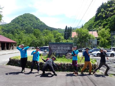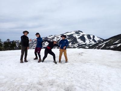 《2日目、今大会の最高到達地点2100m地点にて白山をバックに、A隊メンバーのみ(B隊は時間の関係上、チブリ尾根避難小屋までの登山活動となった)》