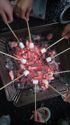 《デザートのマシュマロ、焼いて、または、ビスケットに挟んで食す、部員撮影》
