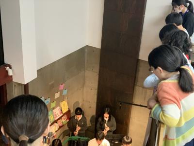 1回目は、吹奏楽部オーボエ奏者の2人が童謡やジブリの曲を披露しました。そして、今回はクラリネットパートの7人が吉本新喜劇のテーマを演奏しました。