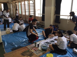 補習の午後、のぼりの制作が行われています。工事の関係で、今年は第1体育館の一角で作業後行われ、22日は1年生、23日は2年生がのぼりを作りました。暑い中、生徒たちは熱心に取り組んでいました。明倫祭本番の際は、ぜひご覧になってください。
