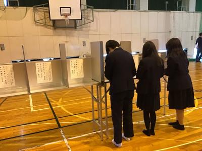 最初に選挙について選管の方々から説明を受け、生徒たちは18歳から選挙権が与えられることを実感していました。