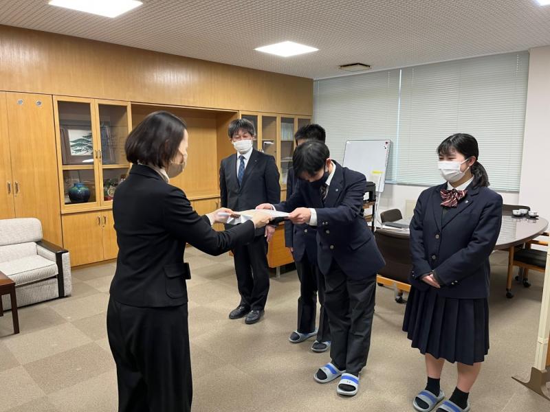 2月7日(火)放課後、校長室で「消費生活啓発リーフレットおよび啓発品の贈呈式」が行われました。