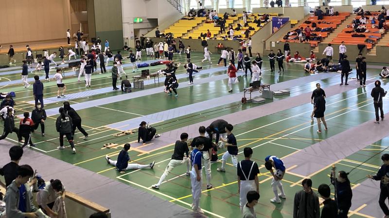 2日目、3日目は個人戦の予選と決勝トーナメントが行われ4人が出場しました。その結果、21H松村くんがエペで(64位/91人)、23H小谷口くんがサーブルで(45位/67人)、それぞれ予選突破し、決勝トーナメントに進出できました。