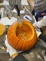 On October 13th, we held a Halloween party. Halloween is at the end of October, however, the Drama Festival is coming soon and we decided to hold our party earlier than usual. We enjoyed wearing Halloween costumes, eating a lot of sweets, and making a jack-o-lantern. It was a lot of fun!! We’ve left the jack-o-lantern in front of the library so that many people can see it. We’re looking forward to a Halloween party next year.