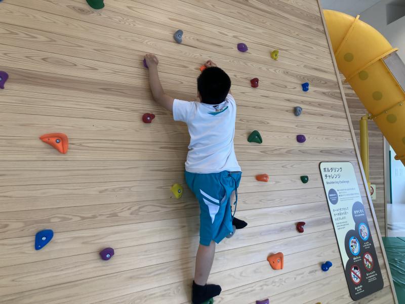 あそびエリアでは、ボルダリングにもチャレンジしていました。